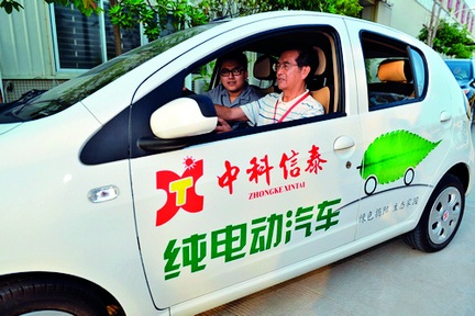 廣東中科信泰新能源公司著力發(fā)展新能源汽車產(chǎn)業(yè),填補了粵東地區(qū)“純電動轎車”生產(chǎn)領域空白。圖為俄羅斯工程學院外籍院士、華南理工大學原校長、教授劉煥彬饒有興致地試開了該公司生產(chǎn)的純電動轎車,親身體驗駕駛感受。
