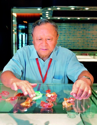 在粵工作院士休養(yǎng)考察團一行參觀了揭陽的陽美玉都,詳細了解陽美翡翠玉雕的發(fā)展歷程以及玉器產(chǎn)業(yè)發(fā)展情況,并認真察看了部分翡翠玉雕作品。圖為魚類生理學專家林浩然院士對玉石做的“魚”很感興趣,一口氣買下了10條。